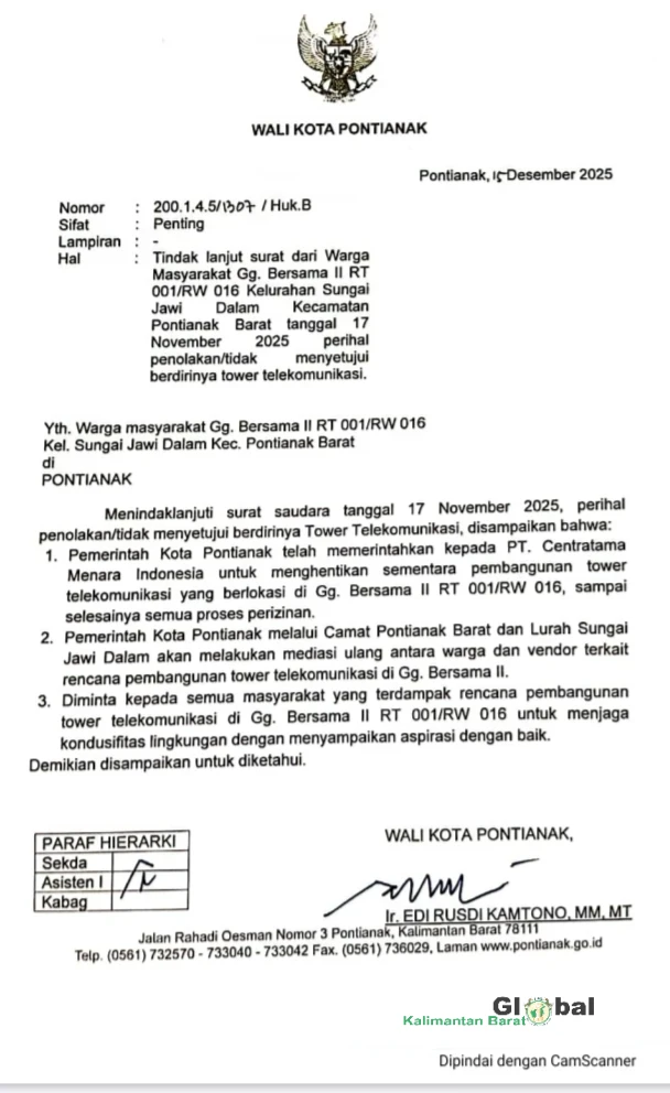 "Pemerintah Kota Pontianak telah memerintahkan kepada PT Centratama Menara Indonesia untuk menghentikan sementara pembangunan tower menara telekomunikasi yang berlokasi di Gang Bersama 2 RT 001/RW 016 sampai selesainya seluruh proses perizinan.”